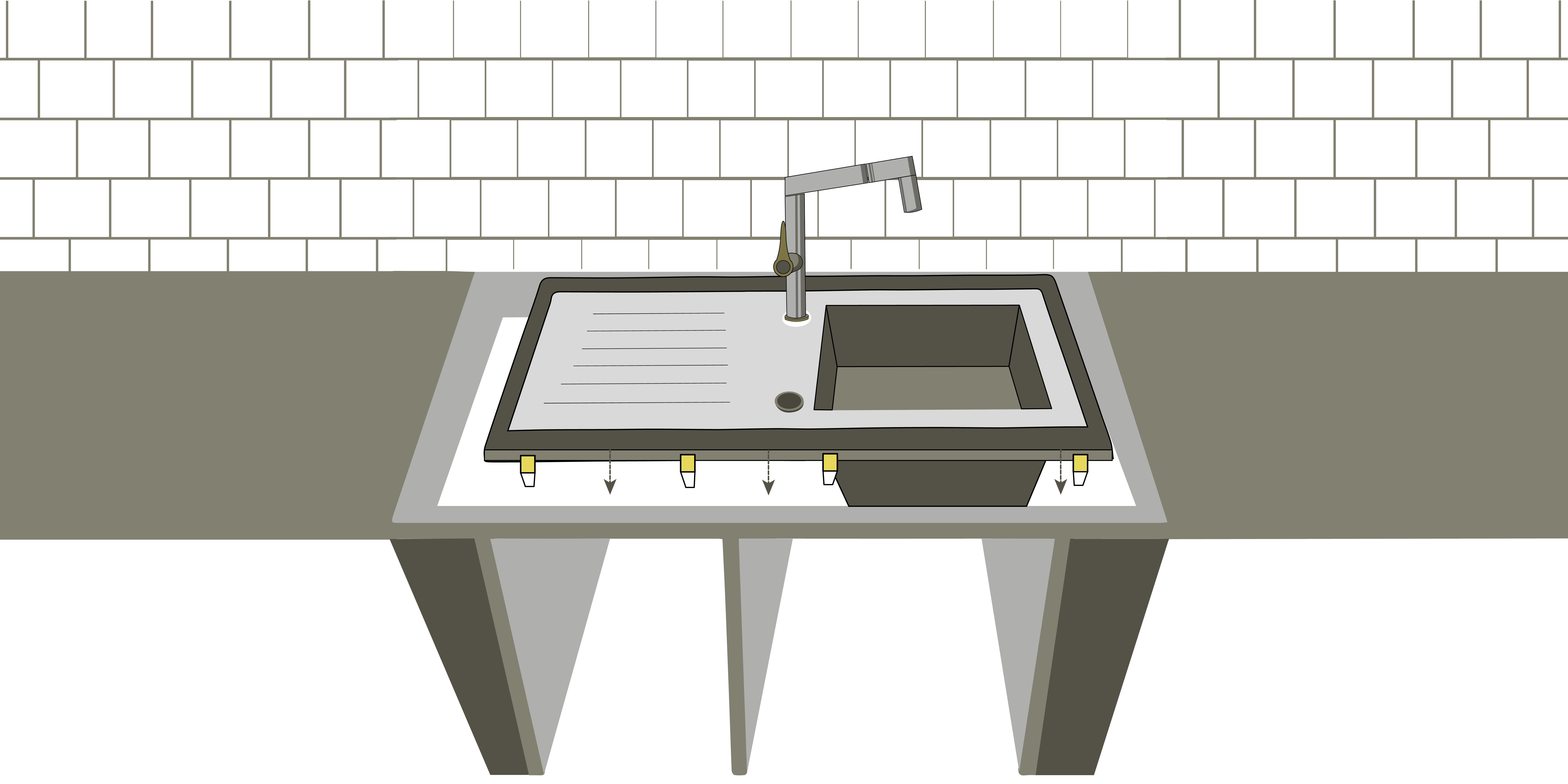 Opatrne osaďte drez (s už namontovanou batériou a príslušenstvom) do výrezu v pracovnej doske. Zo spodnej strany pripevnite k drezu upevňovacie svorky (úchytky), ktoré sú zvyčajne súčasťou balenia. Svorky musia pri nasadzovaní smerovať smerom k okraju pracovnej dosky (dolu od okraja drezu).